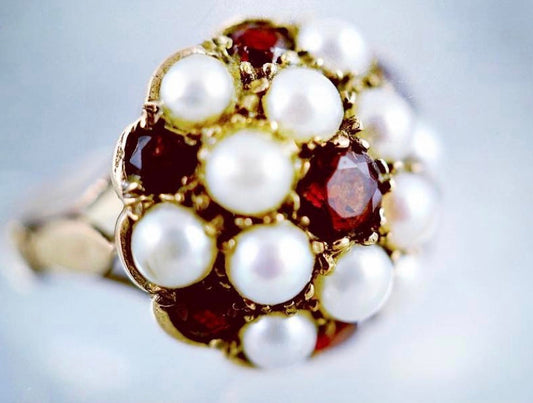 ESTATE VICTORIAN YELLOW GOLD PEARL & BOHEMIAN GARNET PINCUSHION RING