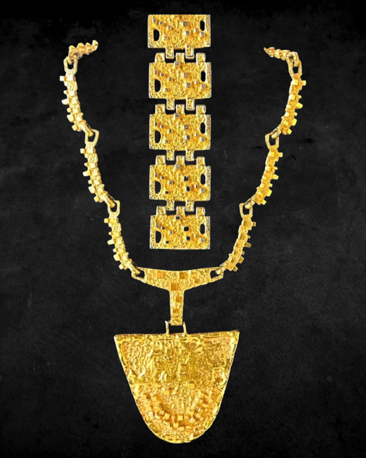 RARE & EPIC BRUTALIST GOLD PLATED PEWTER NECKLACE & BRACELET SET by MID CENTURY MODERN MONTREAL QUEBEC ARCHITECT/DESIGNER ROBERT LARIN