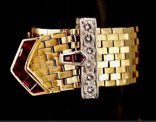 SUSPENDED WHILE SEEK UPDATED APPRAISAL on the PRECIOUS METALS/INQUIRE WITH INTEREST/ YELLOW GOLD & PLATINUM MESH CARTIER STYLE BELT RING NATURAL RUBY & DIAMONDS ADJUSTABLE SIZE