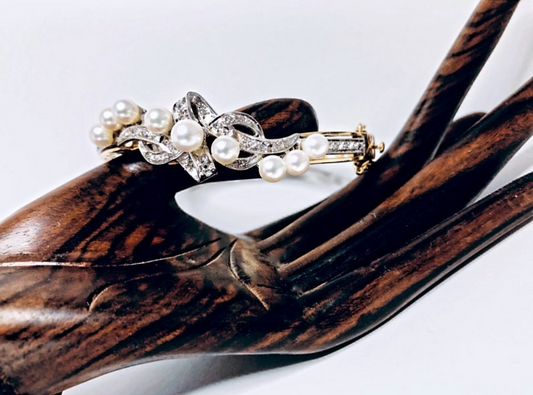 SUSPENDED WHILE SEEK UPDATED APPRAISAL on the PRECIOUS METALS/ INQUIRE W/ INTEREST/VINTAGE PEARLS w/ WHITE & 14kt YELLOW GOLD STUNNING BANGLE ESTATE BRACELET