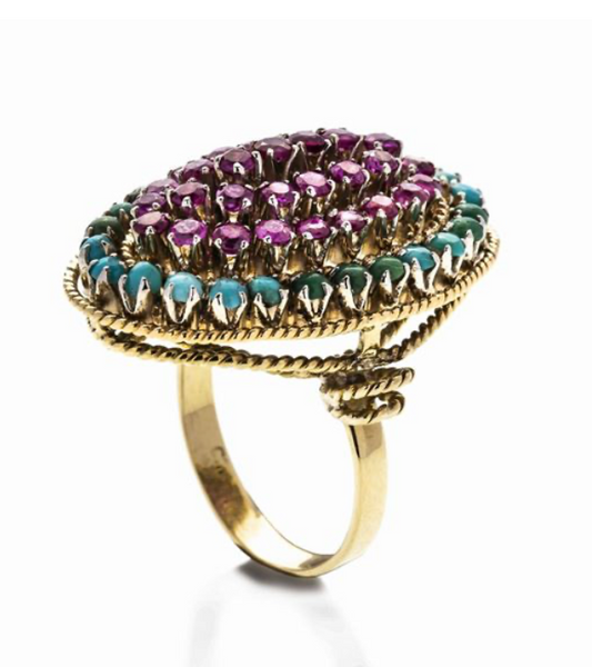 DREAMY NATURAL RUBY & PERSIAN TURQUOISE 18KT YELLOW GOLD ESTATE JEWELRY RING
