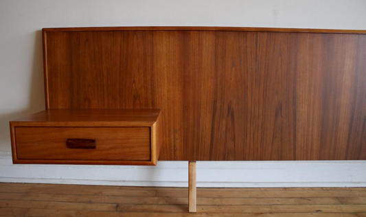 SLEEK STREAMLINED FULL/DOUBLE TEAK HEADBOARD w/ REFINISHED FLOATING BEDSIDE TABLES