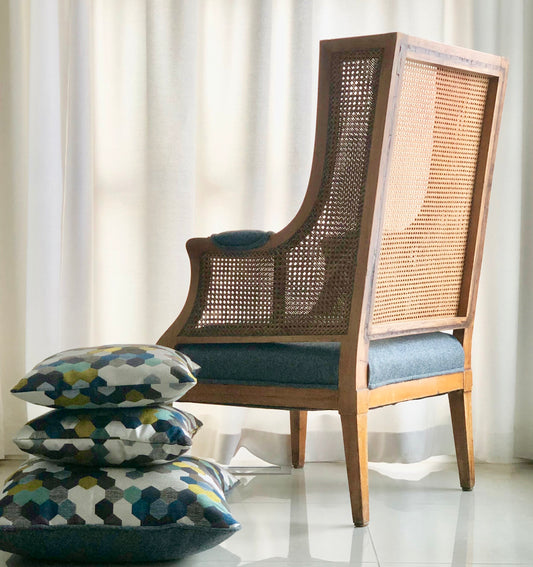 LOUIS XV/XVI FRENCH CANED BERGERE WING CHAIR REUPHOLSTERED