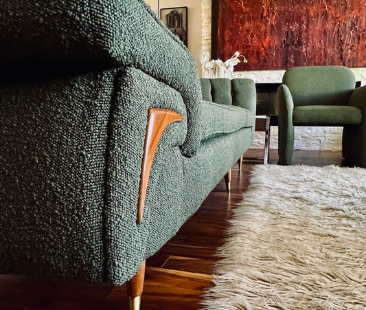 PROFESSIONALLY REUPHOLSTERED COUCH 1940s-1950s MID CENTURY UNIQUE BUILT-IN BARTOP OR LAMP TABLE SOFA