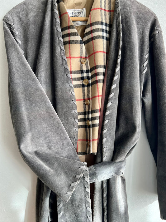 INCREDIBLE VINTAGE GREY MIDI LEATHER BELTED COAT