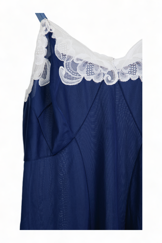 VINTAGE GORGEOUS DEEP BLUE FABELNYL SLIP w/ WHITE LACE DETAIL PINUP DRESS LINGERIE NIGHTIE