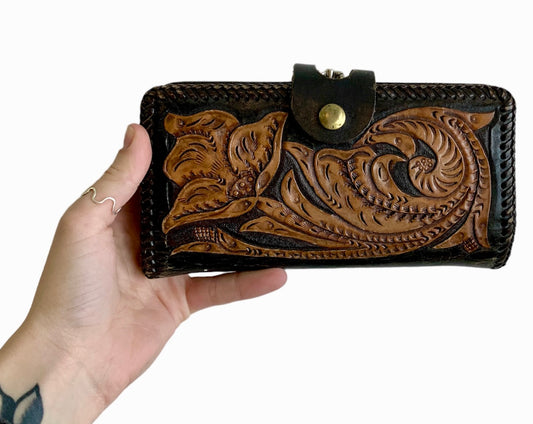 HAND-TOOLED MOTIF WESTERN-STYLE LEATHER WALLET CLUTCH PURSE