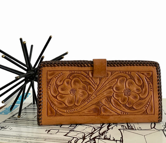 HAND TOOLED WESTERN STYLE LEATHER WILD ROSE FLORAL MOTIF WALLET CLUTCH PURSE