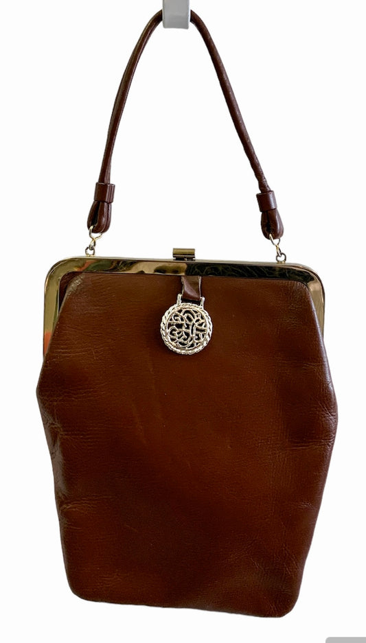 1940s/50s BROWN LEATHER TOP HANDLE HANDBAG w/ BRASS DETAILS