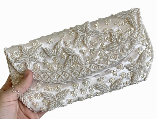 1950s HANDMADE BEADED CREAM SATIN EVENING CLUTCH