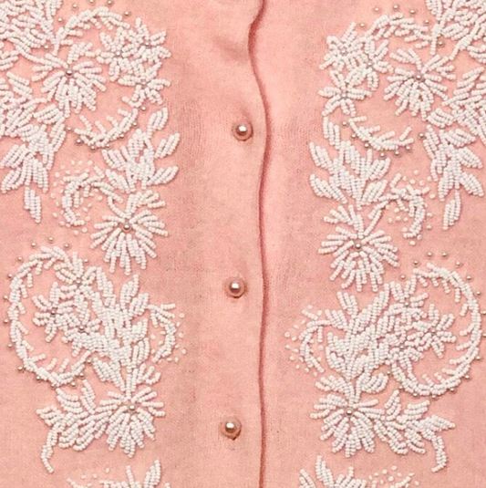 1950s Hong Kong BEADED WOOL/ ANGORA CARDIGAN SWEATER FIFTIES PINK!