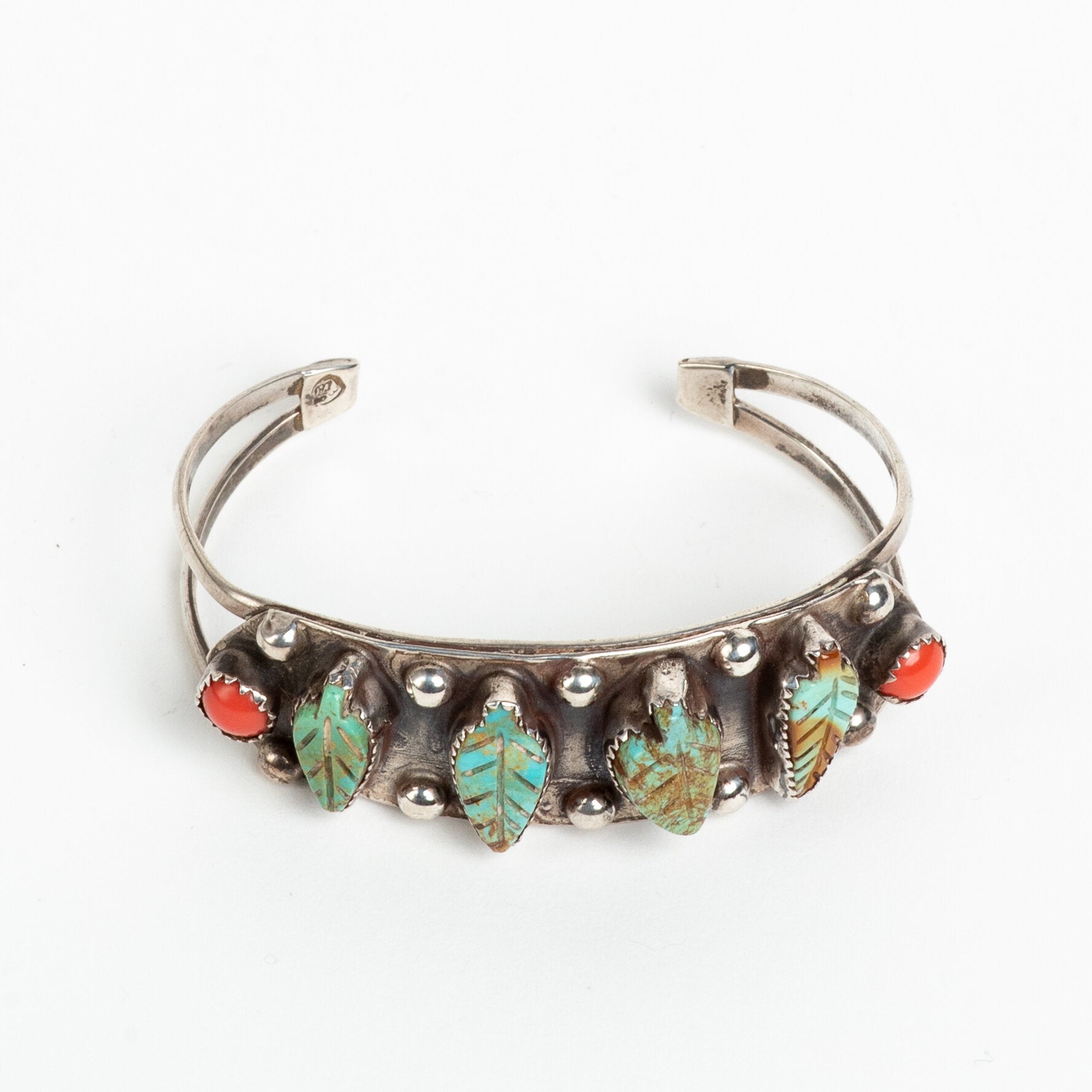 BEAUTIFUL VINTAGE ARTISAN CUFF SILVER, w/ CARVED TURQUOISE & CORAL BRACELET