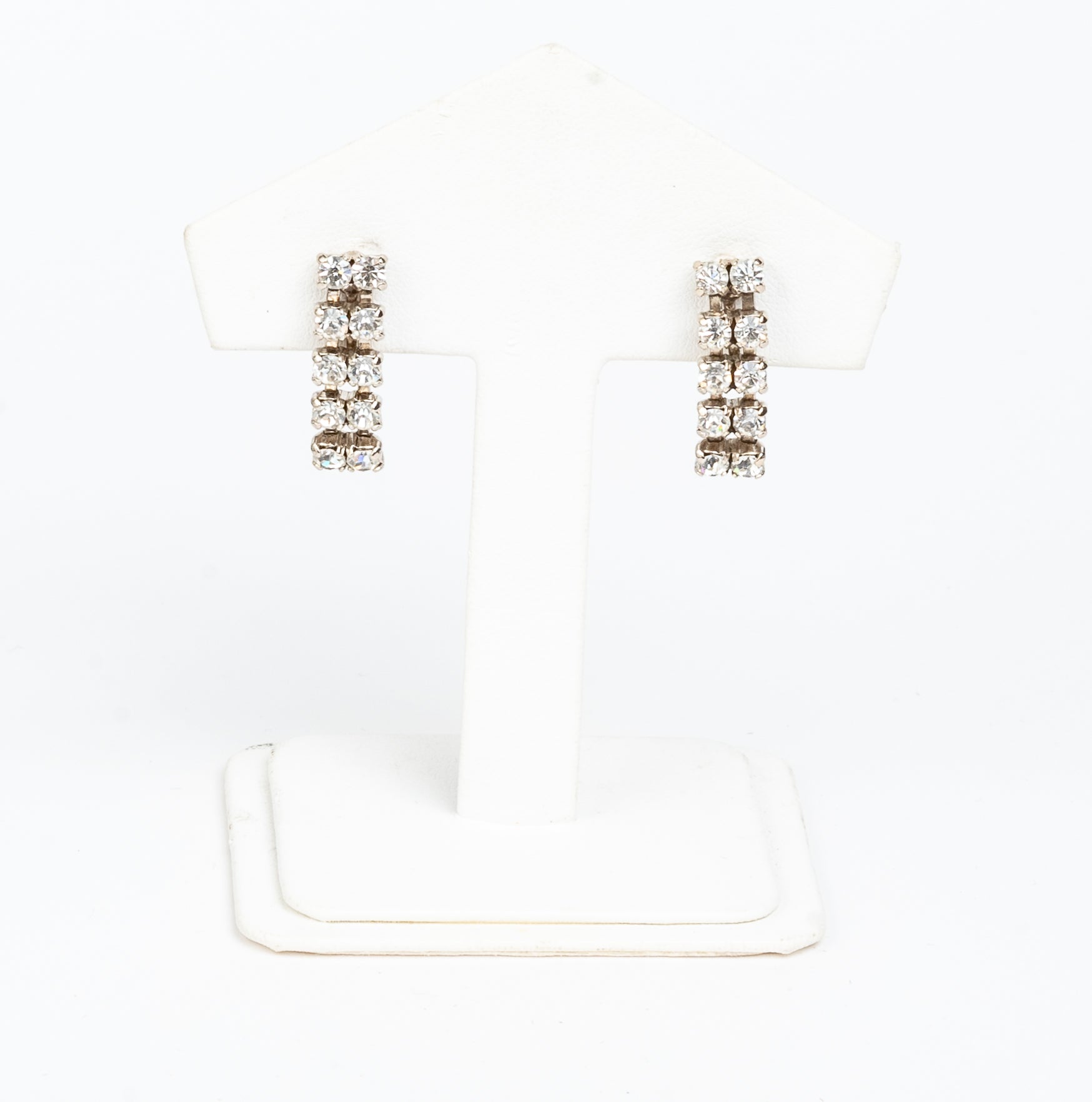 These signed Sherman screw backs feature 2 rows of 5 clear Swavorski crystal rhinestones. The 2 rows allow the rhinestones to move and glitter with movement.The back is beautifully rhodium plate finishing, always the sign of Sherman Jewels commitment to quality throughout. For me, I would wear with jeans or formal without skipping a beat :)