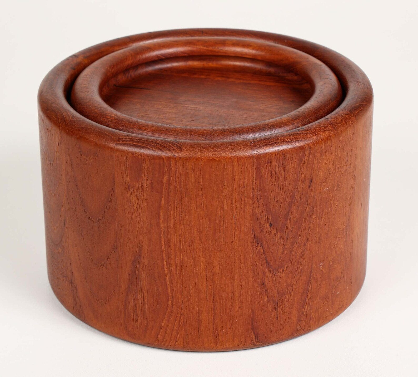 Nissen Denmark Staved Teak Ice Bucket, 1960s. Stunning grain, intact liner. Exquisite mid-century modern design.