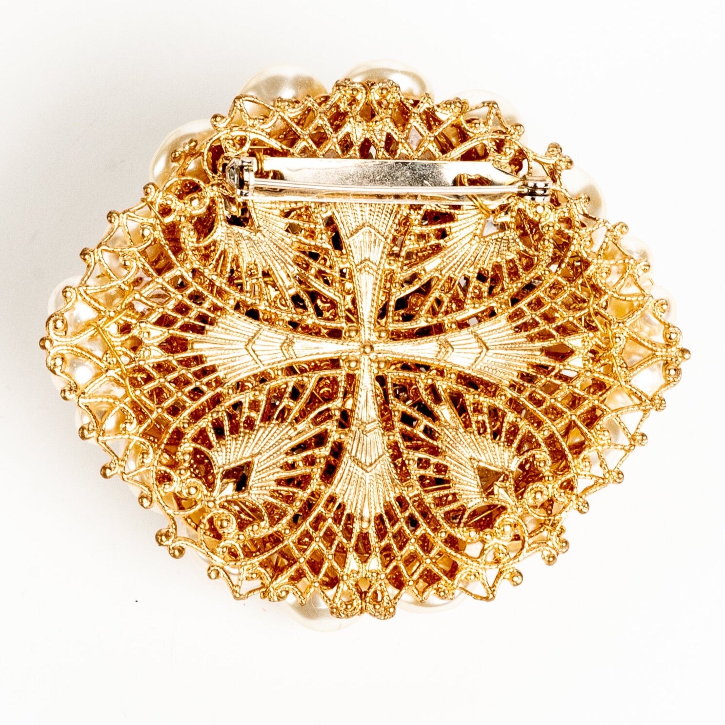 Stunning statement pin. Filigree back and all wired in champagne pearls and prong set rhinestone clusters in a very well made and constructed unique over sized brooch
