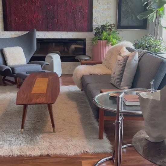 GORGEOUS EXOTIC WOOD SURFBOARD COFFEE TABLE w/ SPLAYED BRASS CAP TAPERED PEG LEGS/ CENTRAL CONTRAST EXOTIC WOOD INLAY & STORAGE DRAWER