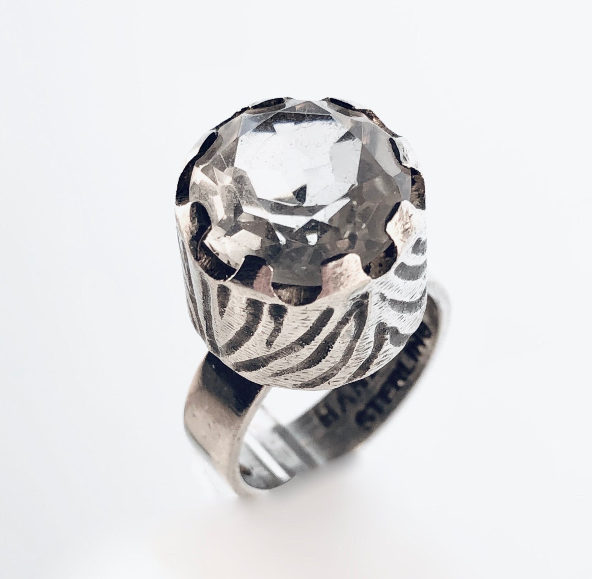 HANDMADE STERLING SILVER & ROCK CRYSTAL MODERNIST RING, SIZE?