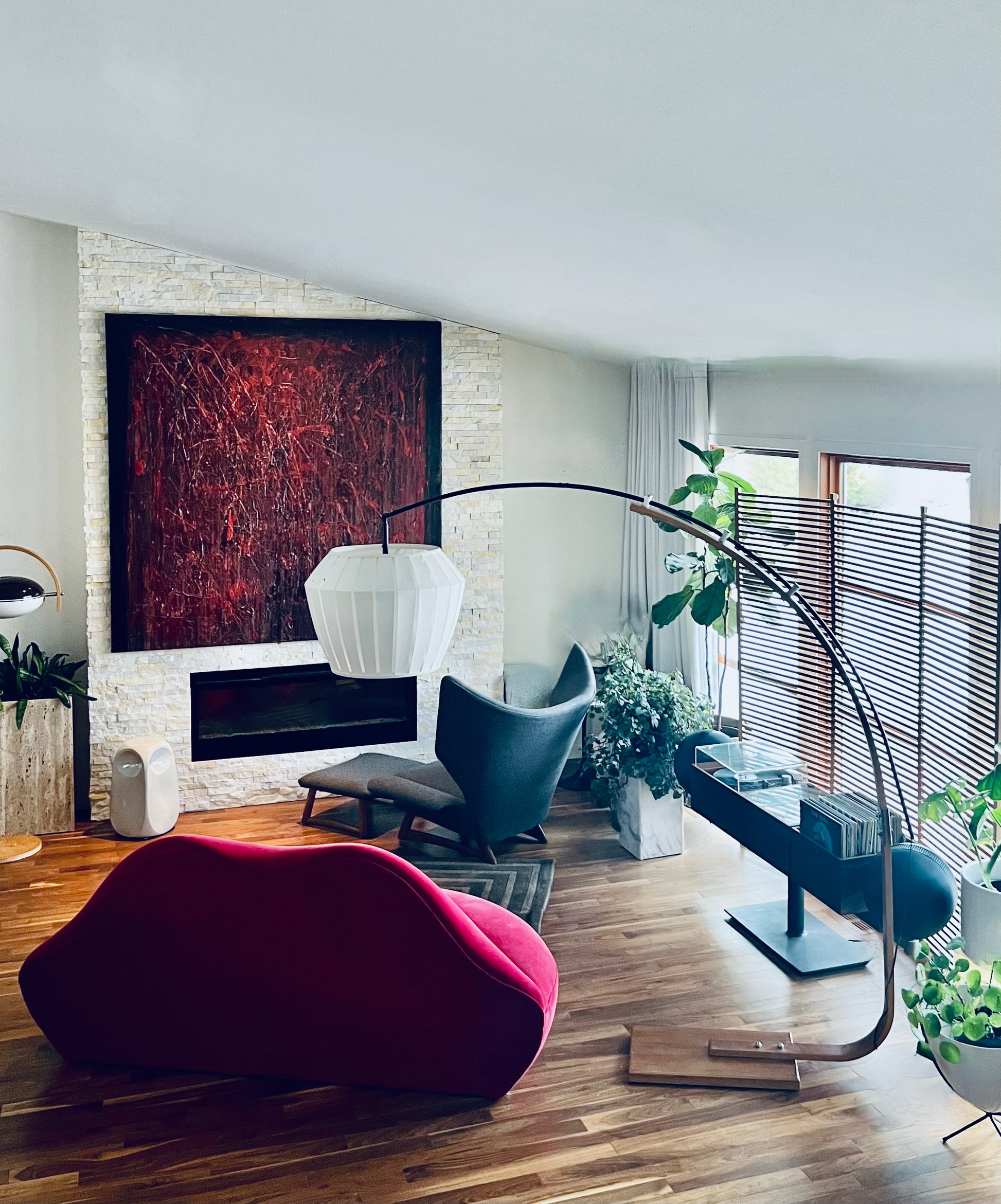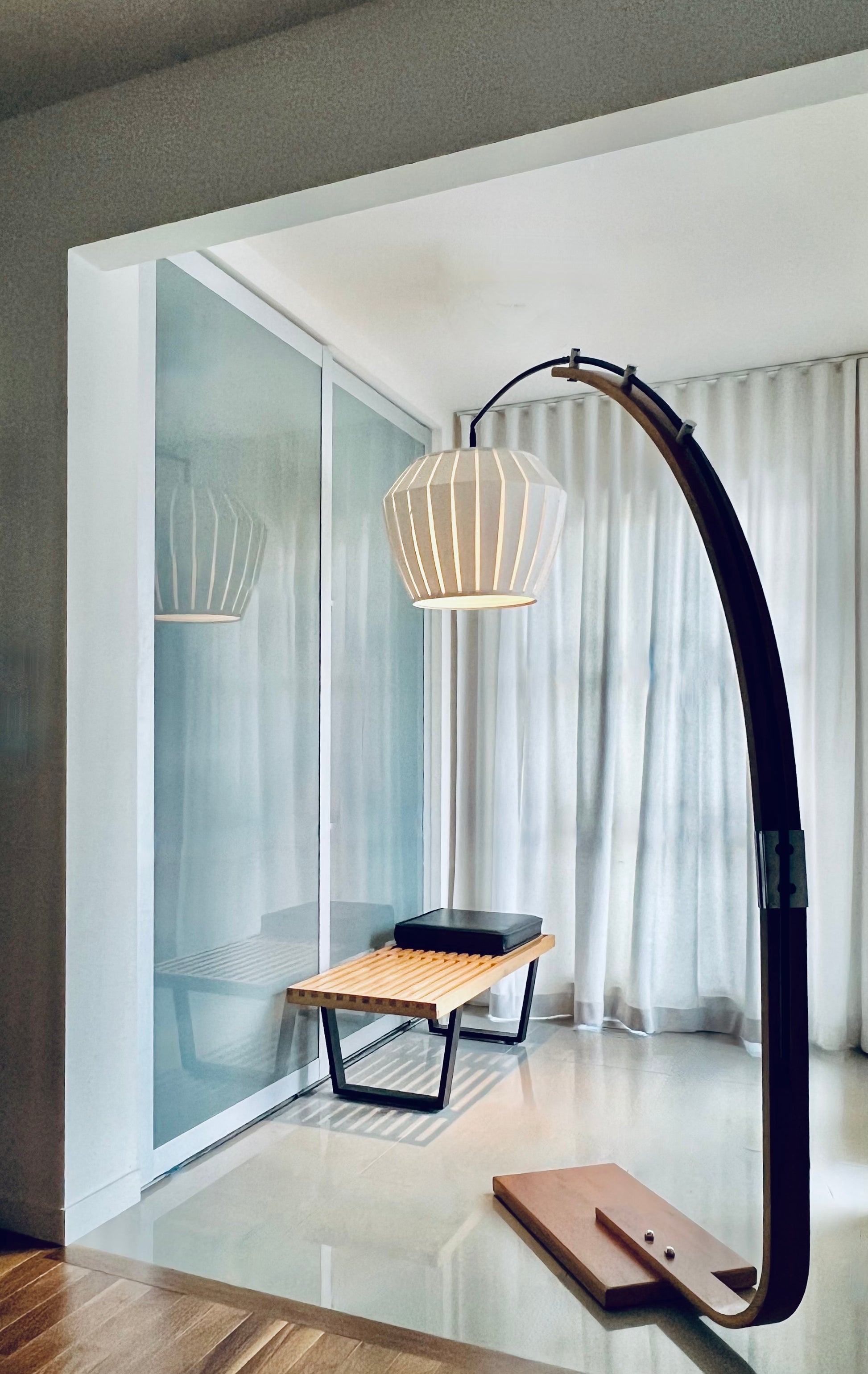 Canadian mid century design bentwood teak extendable arc floor lamp with contemporary shade