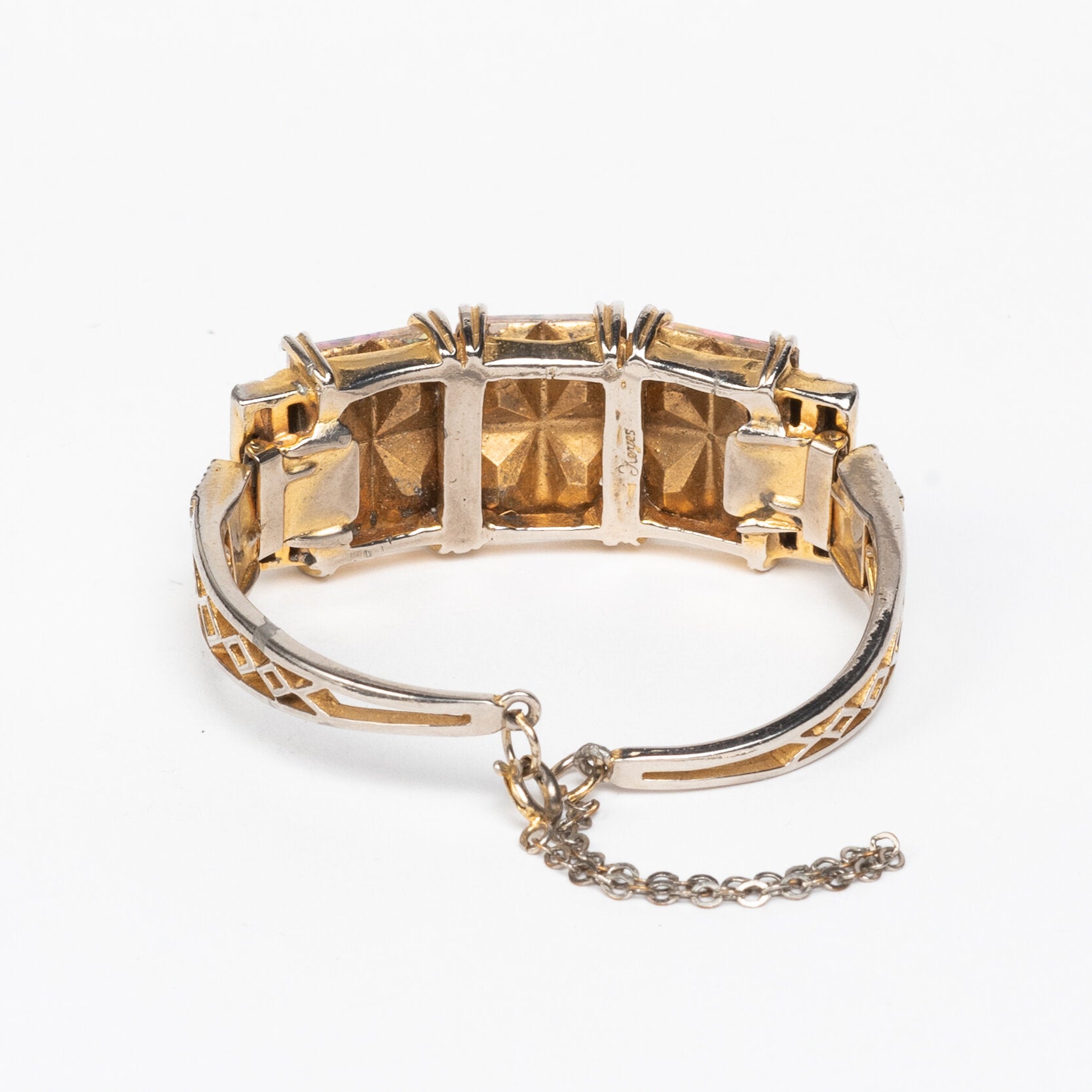 This is really fun and pretty on your wrist. It kind of torques as you open it and is hinged and sprung on both sides of the rhinestones to allow easy on /off and a semi customized fit to your wrist, so it kind of works like a clamper. Some light wear but priced accordingly...would look great with the Czech crystal prong set aurora borealis necklace posted separately .