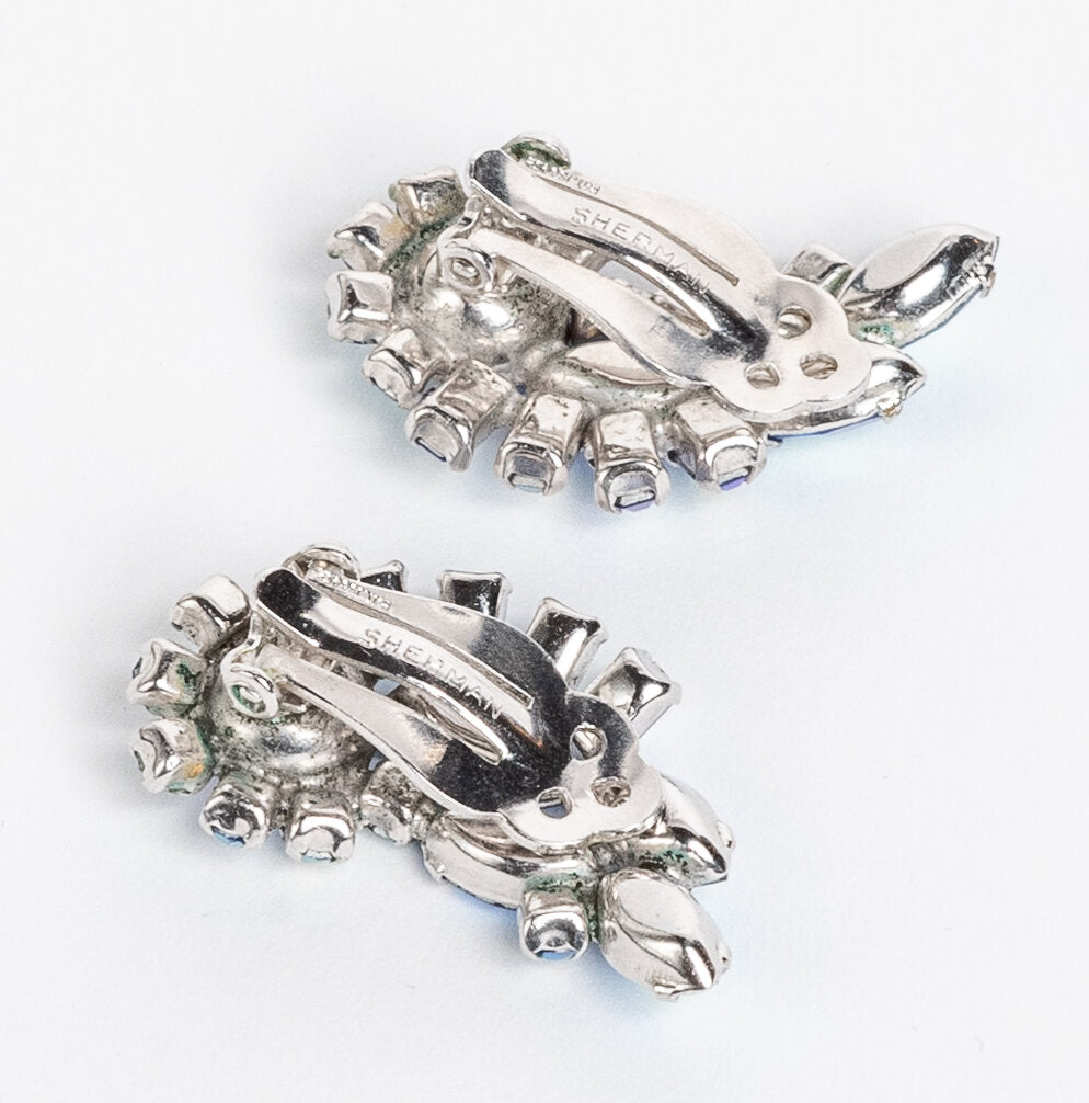 SIGNED SHERMAN BLUE CRYSTAL SWAROVSKI RHINESTONE CLIP ON EARRINGS